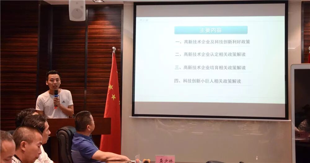APP下载2018年5月23日,联合会应广大会员企业需求,在联合会总部四楼会议室召开政府高新技术企业认定政策解读座谈会。座谈会邀请了联合会4位常务副会长:广州创筑商务咨询有限公司董事长谭武、广州市众享科技服务有限公司董事长符子仪、广东中穗会计师事务所主任薛英章、广州市同合财务咨询有限公司对高新技术企业认定的相关政策进行宣讲,以及申报中遇到的问题进行了解答。
