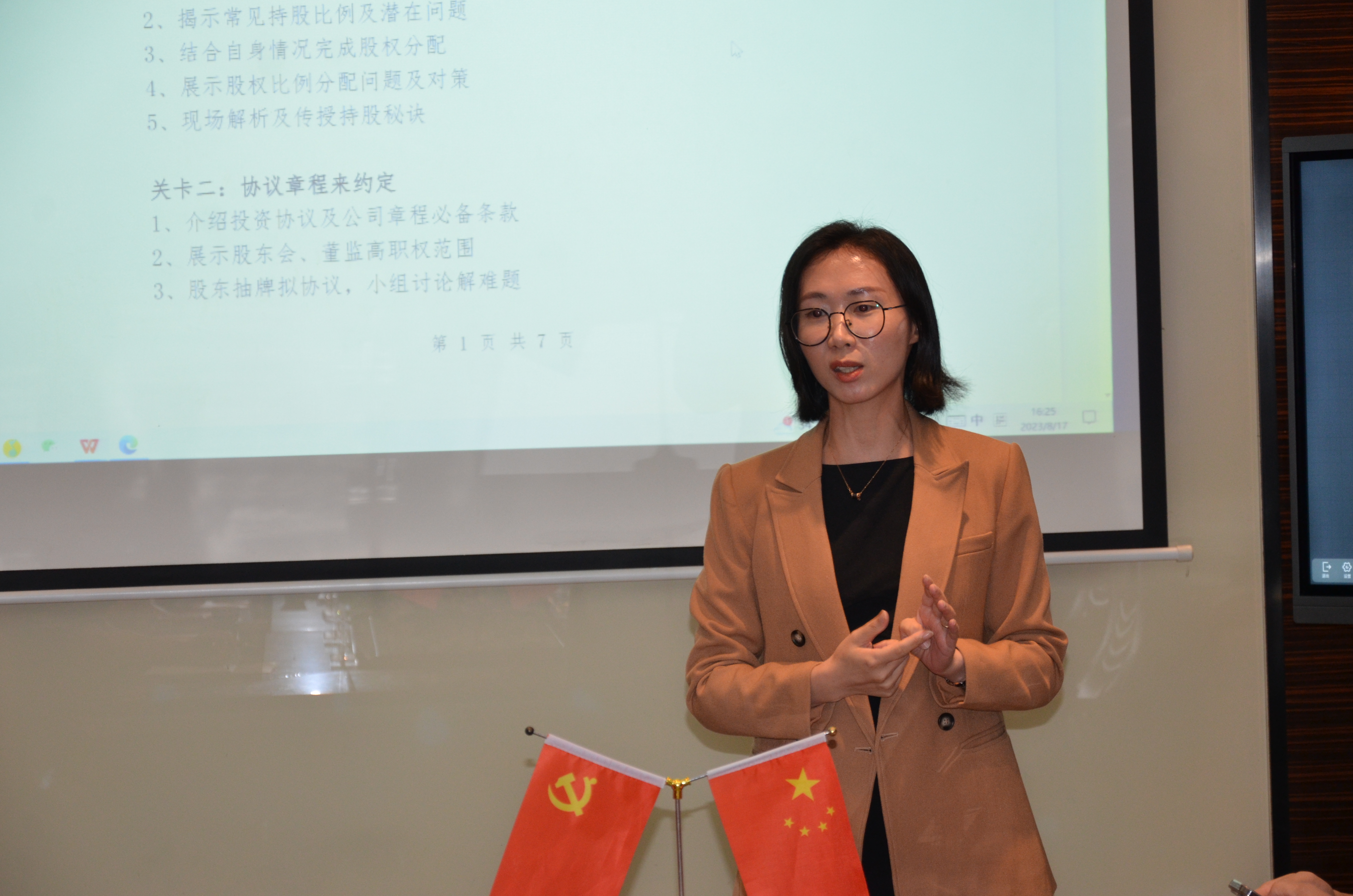刘凯欣律师介绍了事务所以当下时兴的“剧本杀”形式开展的股权创业课程,区别于传统的只听老师讲的股权创业课,各听众将成为股东,以小组形式展开剧情,通过组建公司、触发公司初创剧情、巧妙化解创业难题。在游戏中,听众可以更多与自身实际情况结合,进一步强化了课程的实操性。课程涵盖初业股权设计、股东协议、公司章程、开股东会、股权转让和分红等创业初期关键性问题。